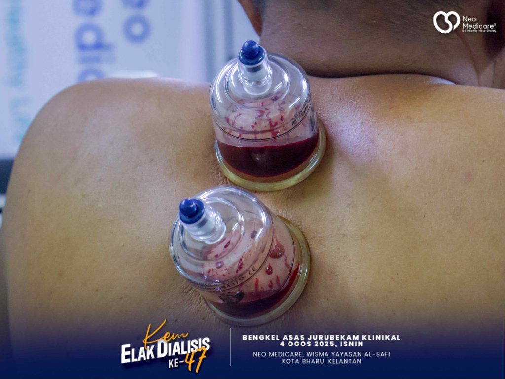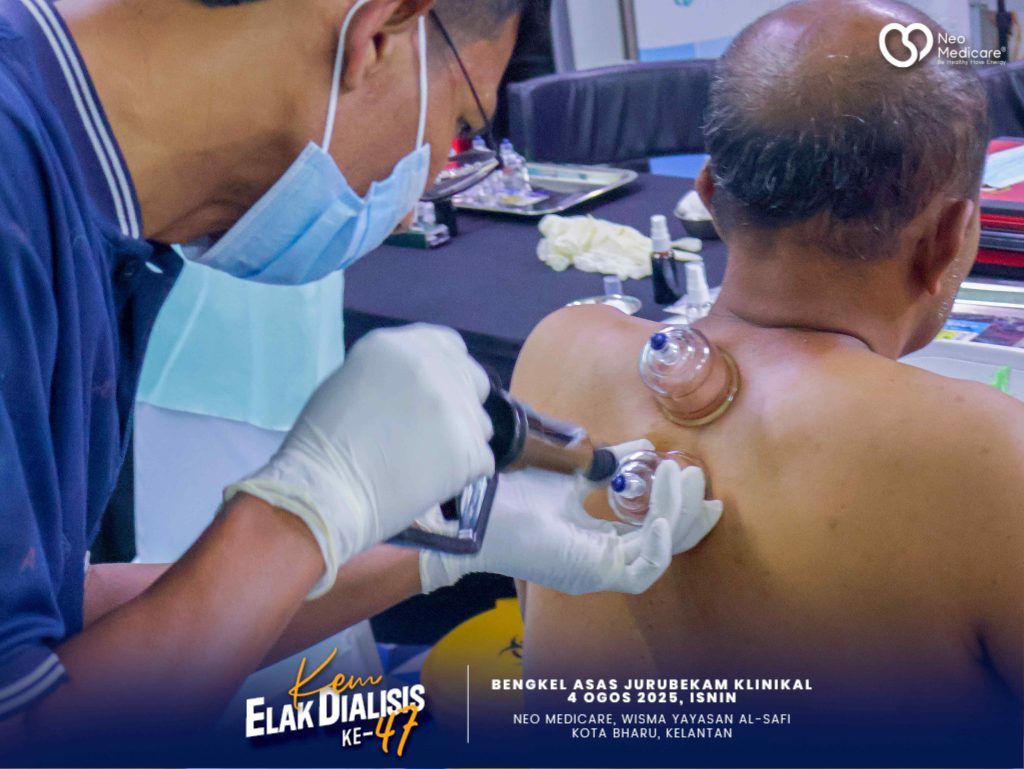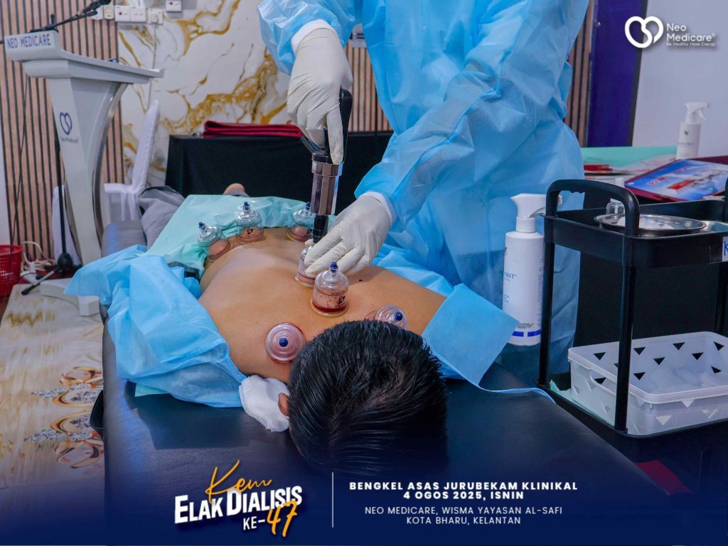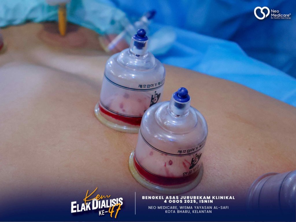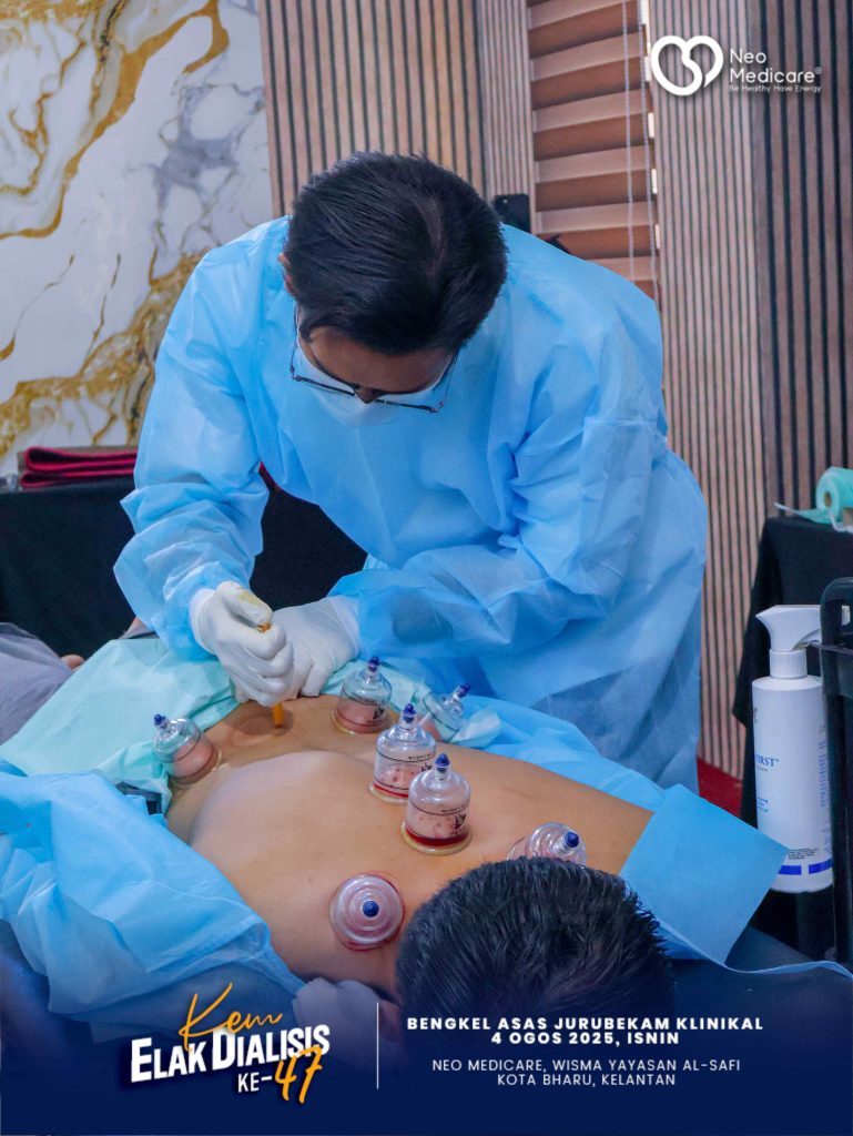 Hari kedua kem elak dialisis dimulakan dengan kelas bekam klinikal bermula jam 9 pagi sehingga jam 12 Tengah hari yang disampaikan oleh Intan Nor Syafiqah binti Mohamed. Kelas bekam praktikal dimulakan dengan menunjukkan cara-cara yang betul untuk melakukan bekam, termasuk jenis cawan yang digunakan.  Selepas itu, kami memberi peluang kepada peserta untuk mempraktikkan teknik bekam di bawah bimbingan tenaga pengajar yang berpengalaman serta mengajar langkah-langkah keselamatan untuk memastikan prosedur dilakukan dengan selamat dan berkesan.