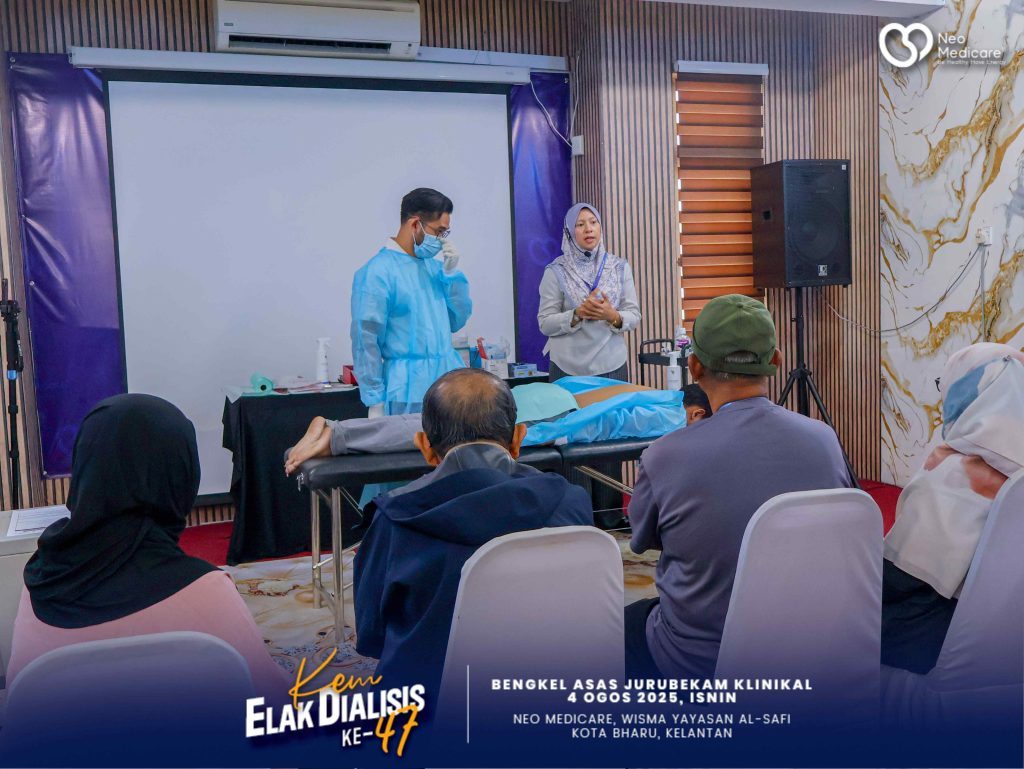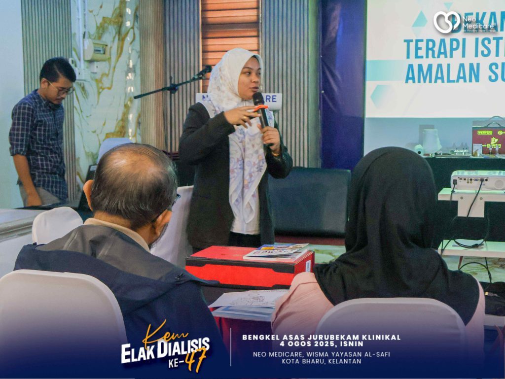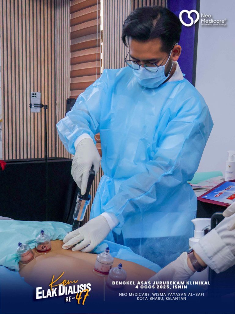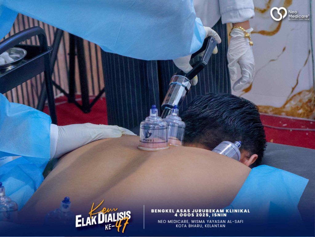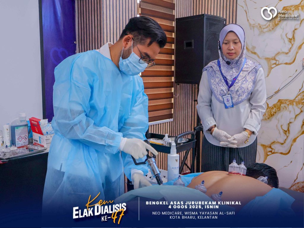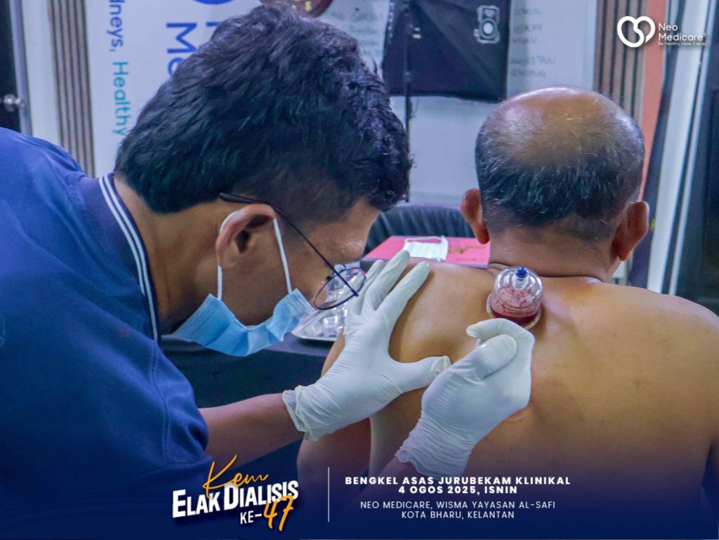 Hari kedua kem elak dialisis dimulakan dengan kelas bekam klinikal bermula jam 9 pagi sehingga jam 12 Tengah hari yang disampaikan oleh Intan Nor Syafiqah binti Mohamed. Kelas bekam praktikal dimulakan dengan menunjukkan cara-cara yang betul untuk melakukan bekam, termasuk jenis cawan yang digunakan.  Selepas itu, kami memberi peluang kepada peserta untuk mempraktikkan teknik bekam di bawah bimbingan tenaga pengajar yang berpengalaman serta mengajar langkah-langkah keselamatan untuk memastikan prosedur dilakukan dengan selamat dan berkesan.
